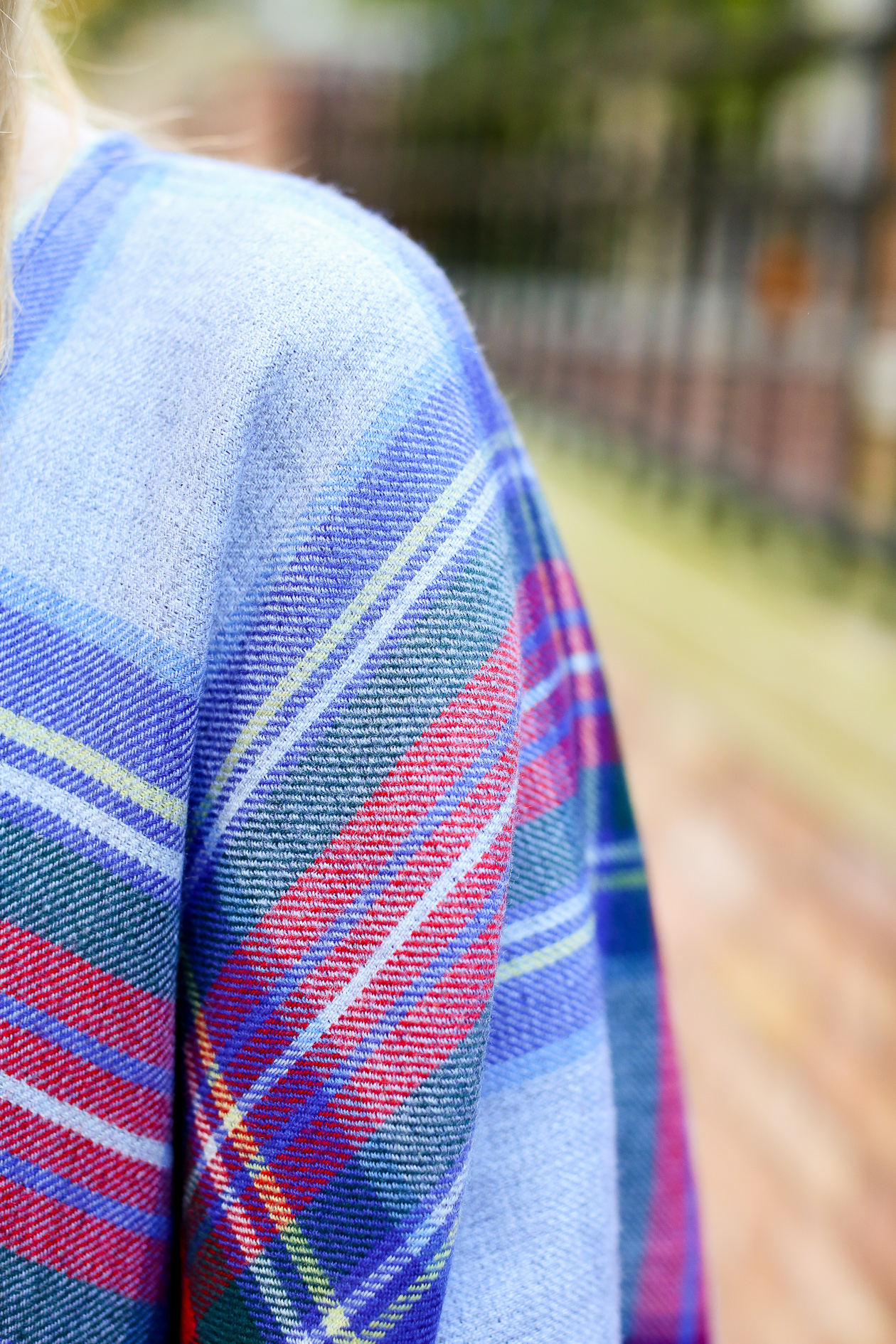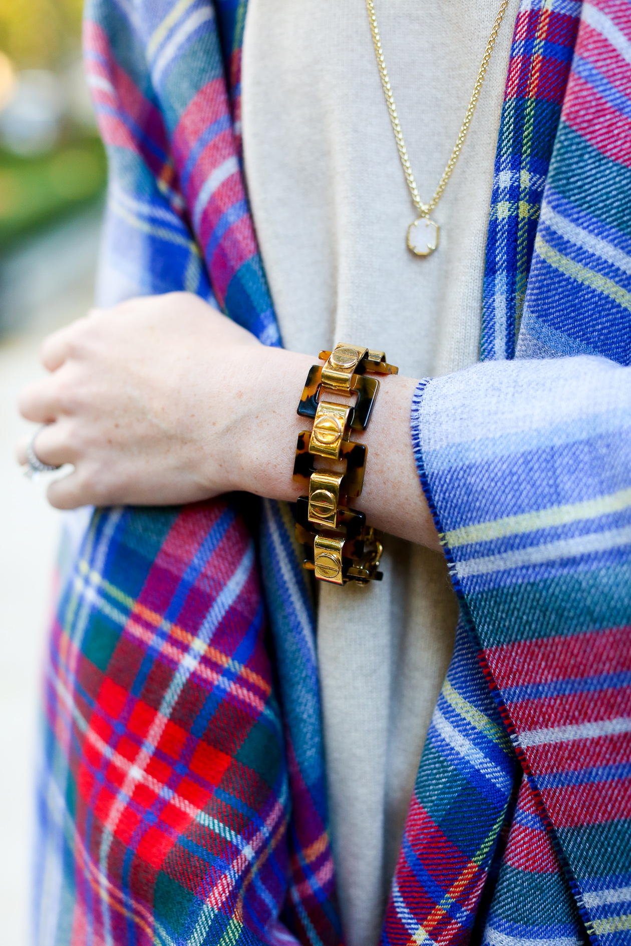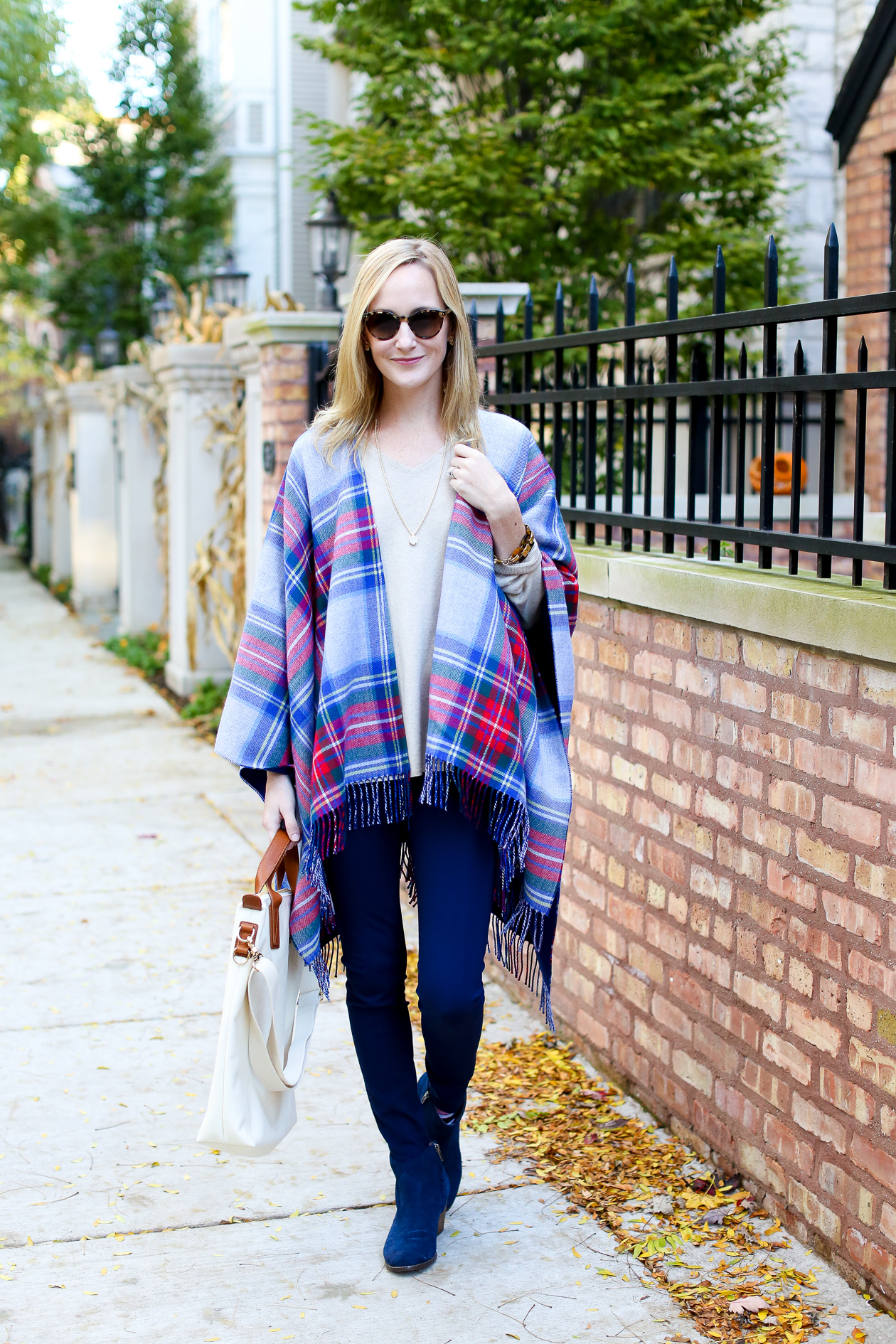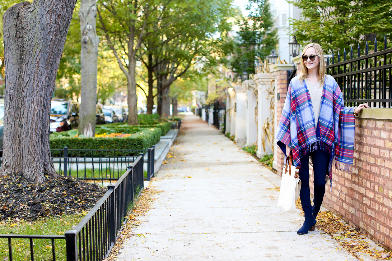 I’m wearing: Vineyard Vines Ponte Pants, Plaid Cape, Canvas Carryall and Cashmere Sweater c/o / Kate Spade Sunglasses (Old, similar here and here) / J.Crew Bracelet / Kendra Scott Necklace and Earrings c/o / Lands’ End Booties c/o (Do we think I wear these enough?!) / C.Wonder Bracelet (Old, similar here, here and here)